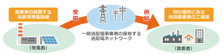 自己託送とは、自家用発電設備を設置する者が、当該自家用発電設備を用いて発電した電気を一般送配電事業者が維持・運用する送配電ネットワークを介して、当該自家用発電設備を設置する者の別の場所にある工場等に送電する際に、当該一般送配電事業者が提供する送電サービスのことです。